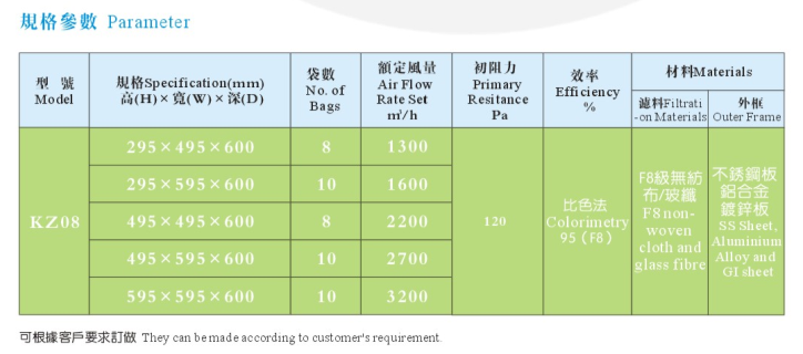 本公司采用的濾材為三層濾料均勻熱熔粘合。第一層粗纖維過(guò)濾棉捕捉空氣中較大的塵埃,較細(xì)的纖維濾紙捕捉空氣中較小的塵埃,最外層無(wú)紡布為強(qiáng)化保護(hù)層。合理的三層設(shè)計(jì)使產(chǎn)品具有優(yōu)良的性能,牢固的熱熔技術(shù)避免了風(fēng)壓產(chǎn)生的泄露,隔網(wǎng)避免了袋與袋之間的貼合,更加細(xì)化了送風(fēng)區(qū)域,降低了阻力,并使容塵量達(dá)到了最大。